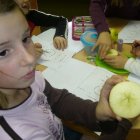 Auf dem Bild kann man die Schüler als "Apfelforscher" sehen.