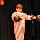 Neben Eltern, Großeltern, Geschwistern und Verwandten der Schüler waren auch zahlreiche Vertreter des öffentlichen Lebens, die Kindergartenkinder aus Rothenberg und viele weitere interessierte Zuschauer in die Alte Turnhalle gekommen. Nach einer kurzen Einlage der Cajon-Gruppe unter Leitung von Marco Born, begrüßte die Schulleiterin Ellen Koch alle Anwesenden und gab die Manege frei für die Chorkinder der Klassen 1 bis 4 und den Zirkus Buntelli. Dieser soll nach dem Willen des Oberverwaltungsfachrates Müller I (Sofia Rodemich) und dem Verwaltungsbeamten Müller II (Simon Müller) mit sofortiger Wirkung verboten werden. Der Zirkusdirektor (Shania Flick) lässt sich davon erst einmal nicht abhalten und lässt die Zirkusartisten eindrucksvoll beweisen, was der Zirkus Buntelli alles zu bieten hat: