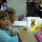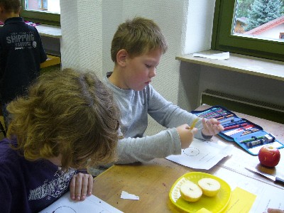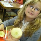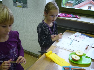 Auf dem Bild kann man die Schüler als "Apfelforscher" sehen.